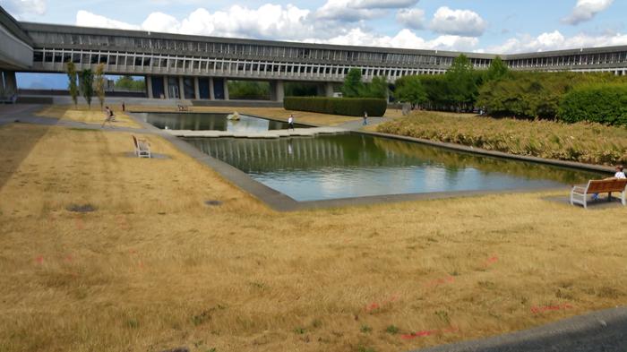Located in the Simon Fraser University's interior courtyard of the Academic Quadrangle is the SFU Reflecting Pond. Most times of the year is full of Koi fish and occasionally when temperatures drop below zero becomes the surface for ice hockey.