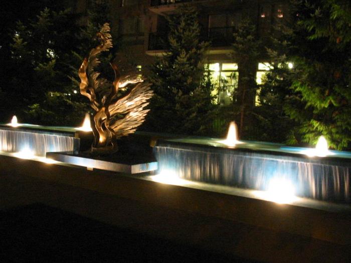 At first glance I was tempted to call the sculpture angel or eagle wings, but after only a moments consideration, it became clear that it is a wind swept coniferous tree, of the type that is so common on the west coast of Vancouver Island. These stunted, often very old trees considering their small size, are Nature's bonsai, no doubt the inspiration for the original Japanese bonsai masters, who also lived on the edge of the fierce Pacific Rim. The pond's stepped falls and small dancing fountains can't possibly mimic the Pacific Ocean, but are a decent perch for this wonderful sculpture of a wind swept tree to rest.