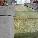 Reptilian is for the tightly packed geometric smooth coloured stone mosiac which covers the surface of the pool and the falls and made me think of reptile skin. Its really beautiful though it will probably take some contemplation before that becomes evident. This pond and falls has some interesting features. Closer to Beach Avenue is a large (1.5 meter diameter) black sphere which rests at the end of a stripe about 6 inches wide and 20 meters long which is surfaced by the reptile skin. If you stand beside the black sphere and look along the reptile skin line you can see it lines up with the notch in the pool through which the water spills down onto the falls. You will also notice that the water in this notch seems to blend into the water of False Creek. Nice optical illusion. When you stand on the waterfront path you can see the three levels of the reptile skinned falls glistening with the water spilling down onto it from the pond above. This is a very nice piece of work. I'd bet only a very few people have noticed the line, the black sphere and the notch water blending into the water of False Creek. Next time you are there, become one of them!