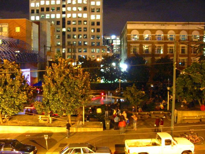 This series of photos was taken from a building across Richards Street from Cathedral Square on a time delay and auto-shutter. A kind of open air free rave was put on in the park. The lights and fog machine combined with the large pool and fountains to create a magical if short lived ambiance.